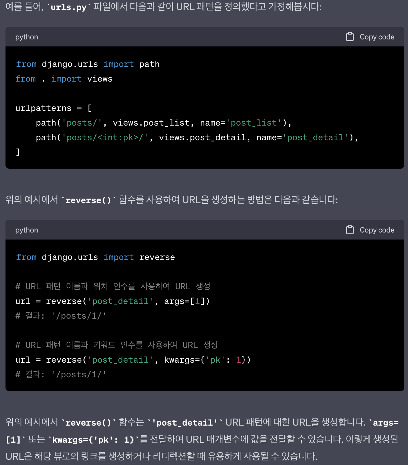 그리고 reverse()와 args=[post.pk]가 무엇인지 잘 모르겠습니다.
