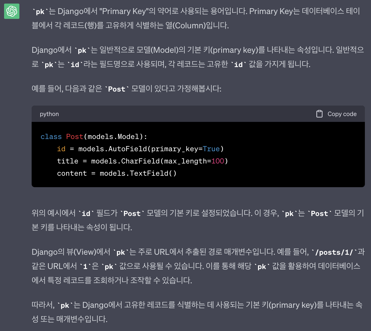 멋사 BE Django수업의 첫날은 models.py 작성이었습니다. models.py는 어렵지 않게 작성하였지만, 다음 과제인 views.py를 작성하면서 꽤 애먹었어요. 이번 과제의 목표는 views.py에서 post에 대한 CRUD기능을 만들고 tests.py에서 테스트 코드를 작성하는 것이었습니다. 예제 코드가 있었지만 봐도 무슨 말인지 모르겠고, 운영진분이 추천하는 책도 사서 조금 읽었지만 이해가 될 듯 말 듯하고.. chatGPT한테 예제 코드를 물어봐가면서 어떻게든 해내버렸습니다.