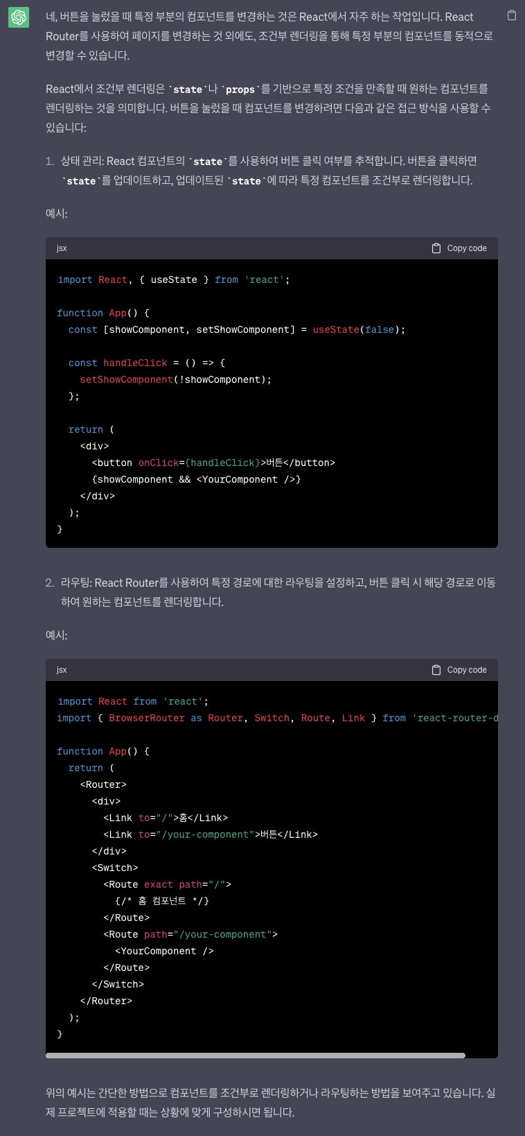 '이 버튼을 누르면 다른 페이지가 아니라 다른 컴포넌트가 보였으면 좋겠는데 어떻게 해야하지?'