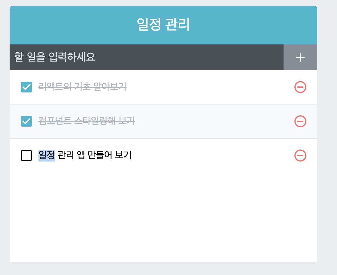 - TodoListItem: 항목에 대한 정보. todo객체를 props로 받아와 상태에 따른 UI를 보여줌.