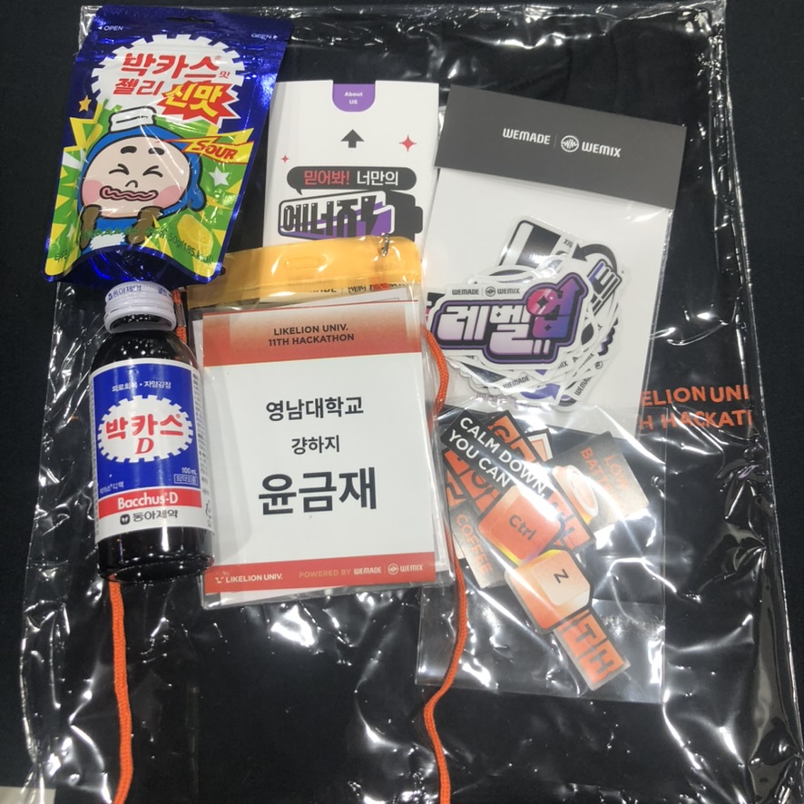 해커톤에도 기업 부스가 왔는데, 화장품 샘플 세트와 뚜껑달린 캔 사이다를 받았다.