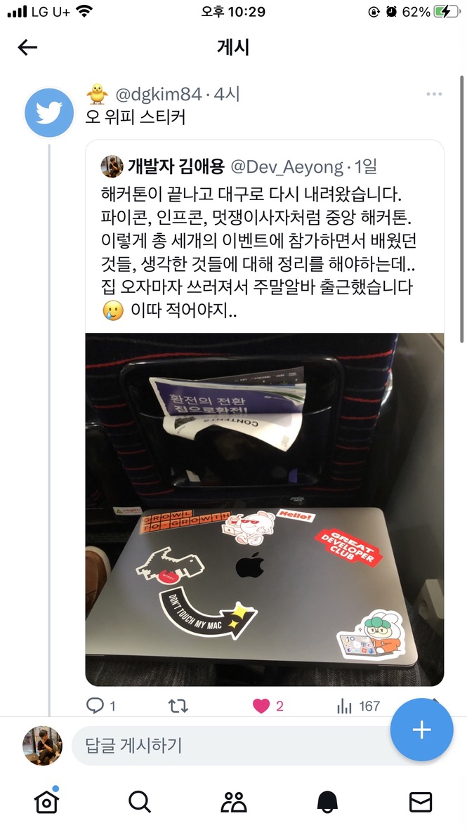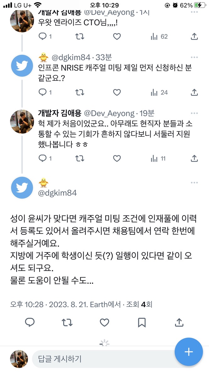 개발자분들이 트위터를 많이 사용하시는 것 같아서 트위터 계정을 만들고 뭐라도 올리고 있었다.
