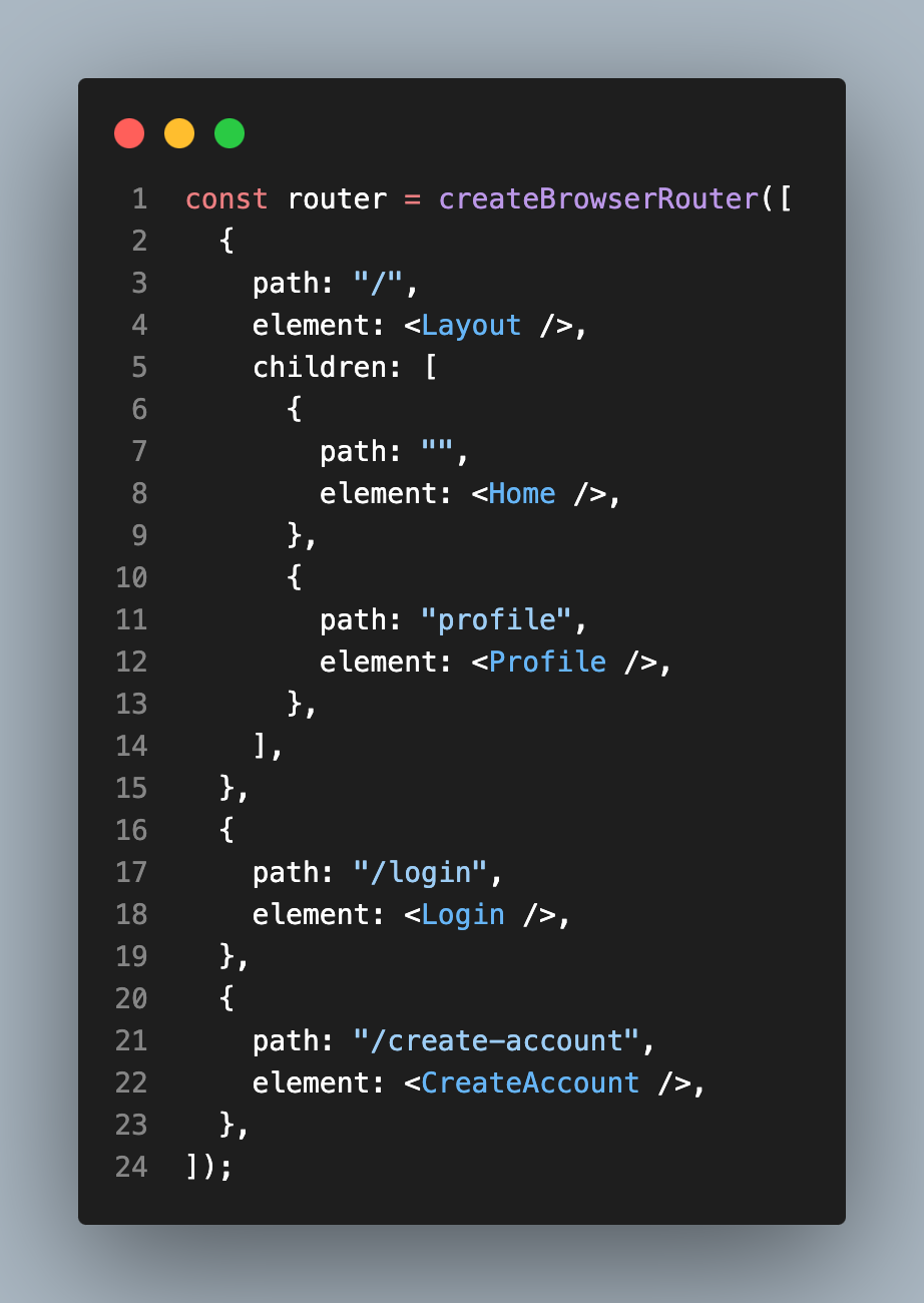 또한, Layout의 children으로 Home, Profile이 있고 Login, CreateAccount는 외부에 위치하면서 로그인이 된 사용자들만 Layout과 그 하위 페이지들을 볼 수 있게 하는 식으로 활용할 수 있다.