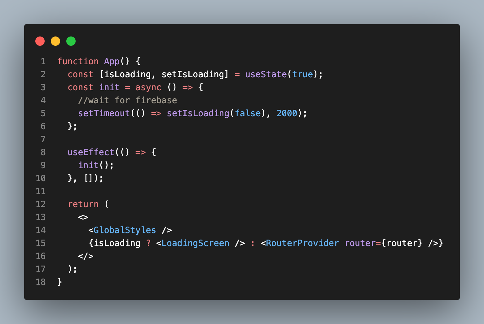 init 함수를 비동기 함수로 작성하는데, firebase 로딩 시간을 임의로 가정해서(2s) 이 시간이 지나면 로딩 상태를 false로 변경한다.
