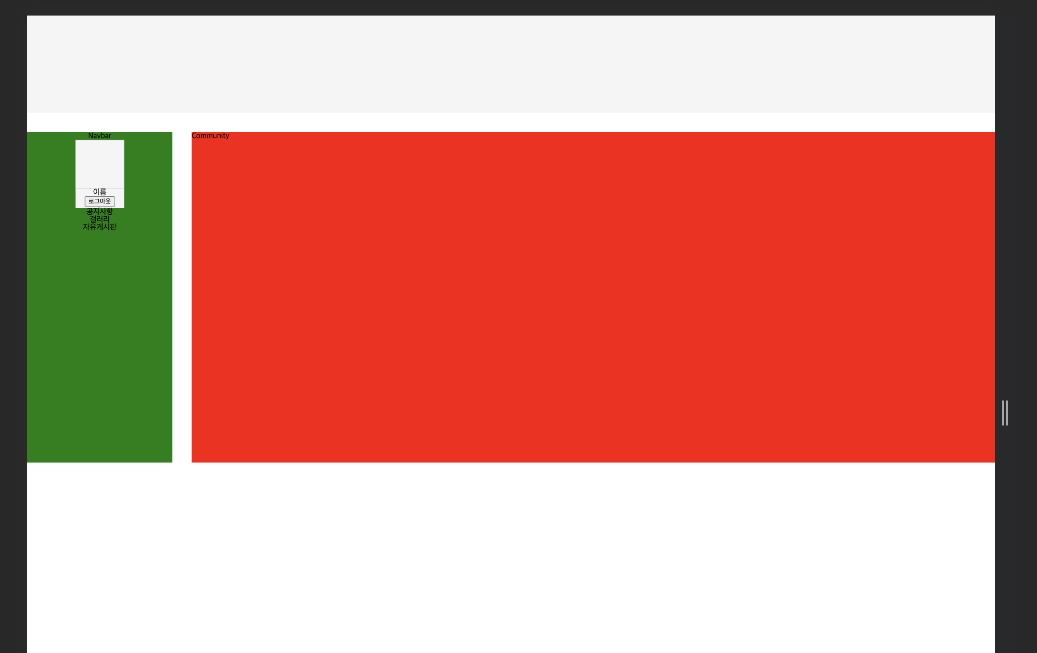 위의 회색 구역에는 로고가 들어갈 것이고, 초록색 구역은 사용자 프로필을 확인할 수 있는 구역과 네비게이션 바가 위치한다.